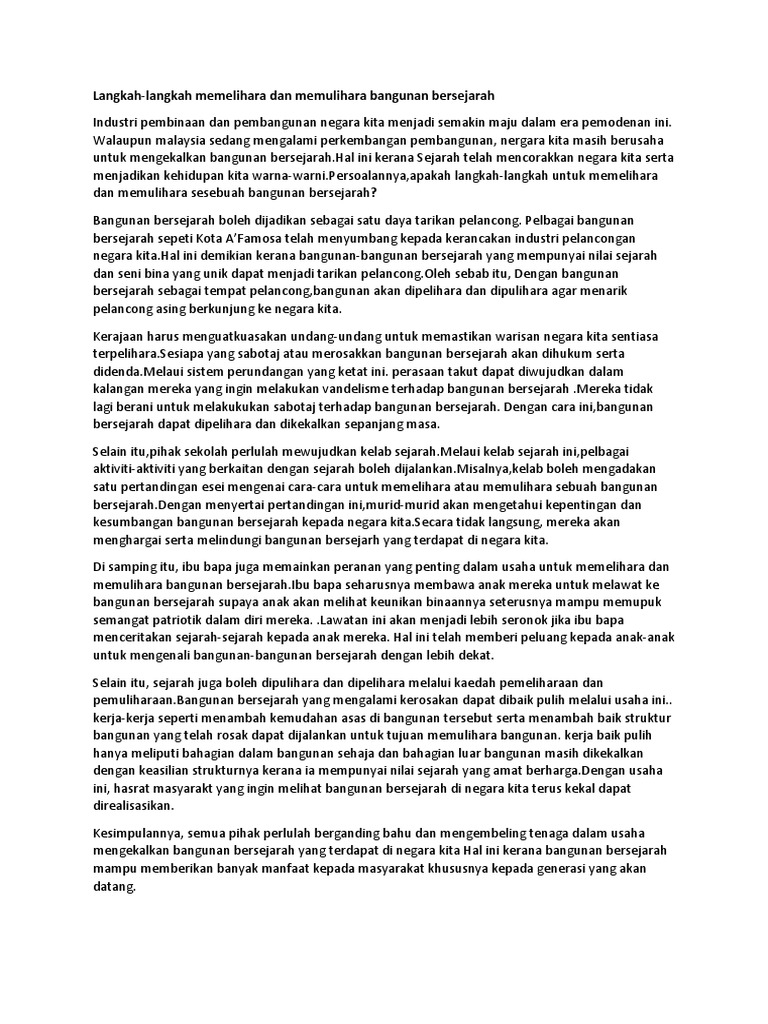 Cintailah sejarah ibu pertiwi kita demi kematangan perjuangan rakyat kita kerana nilai sejarah tak lapuk dek hujan tak lekang dek panas. Jika anda menghadapi pilihan soalan atau tajuk yang berkaitan dengan kepentingan mempelajari sejarah kepada pelajar anda boleh merujuk contoh di bawah yang turut disertakan isi-isi penting serta huraian. Contoh Karangan SPM Langkah-Langkah Pemeliharaan Dan Pemuliharaan Warisan Sejarah Warisan sejarah amat penting untuk generasi akan datang.