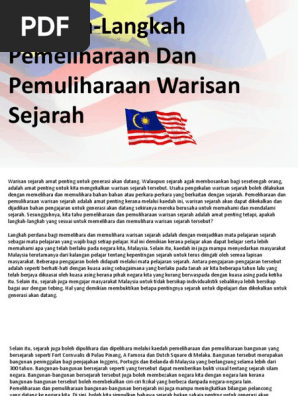 Dalam meniti arus kemodenan yang berteraskan sains dan teknologi maklumat faktor kesihatan masyarakat pada hari ini berada pada tahap yang membimbangkan pihak berkuasa. Langkah-Langkah Pemeliharaan Dan Pemuliharaan Warisan SejarahSijil Pelajaran Malaysia. Memberikan insentif kepada penggiat warisan seni dan budaya.